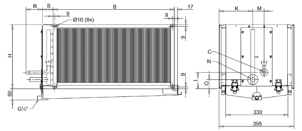 wentylatora lub kolanem kanału. Po zainstalowaniu chłodnicy przed wentylatorem, upewnij się, że wilgotne powietrze za chłodnicą nie doprowadzi do awarii silnika i innych elementów wentylatora. Max. prędkość powietrza bez odkraplaca 2,5 m/s przy zastosowaniu jako chłodnicy. Wylot kondensatu G ½ ”(K) powinien być podłączony przez syfon, aby zapobiec przeciekowi powietrza.
