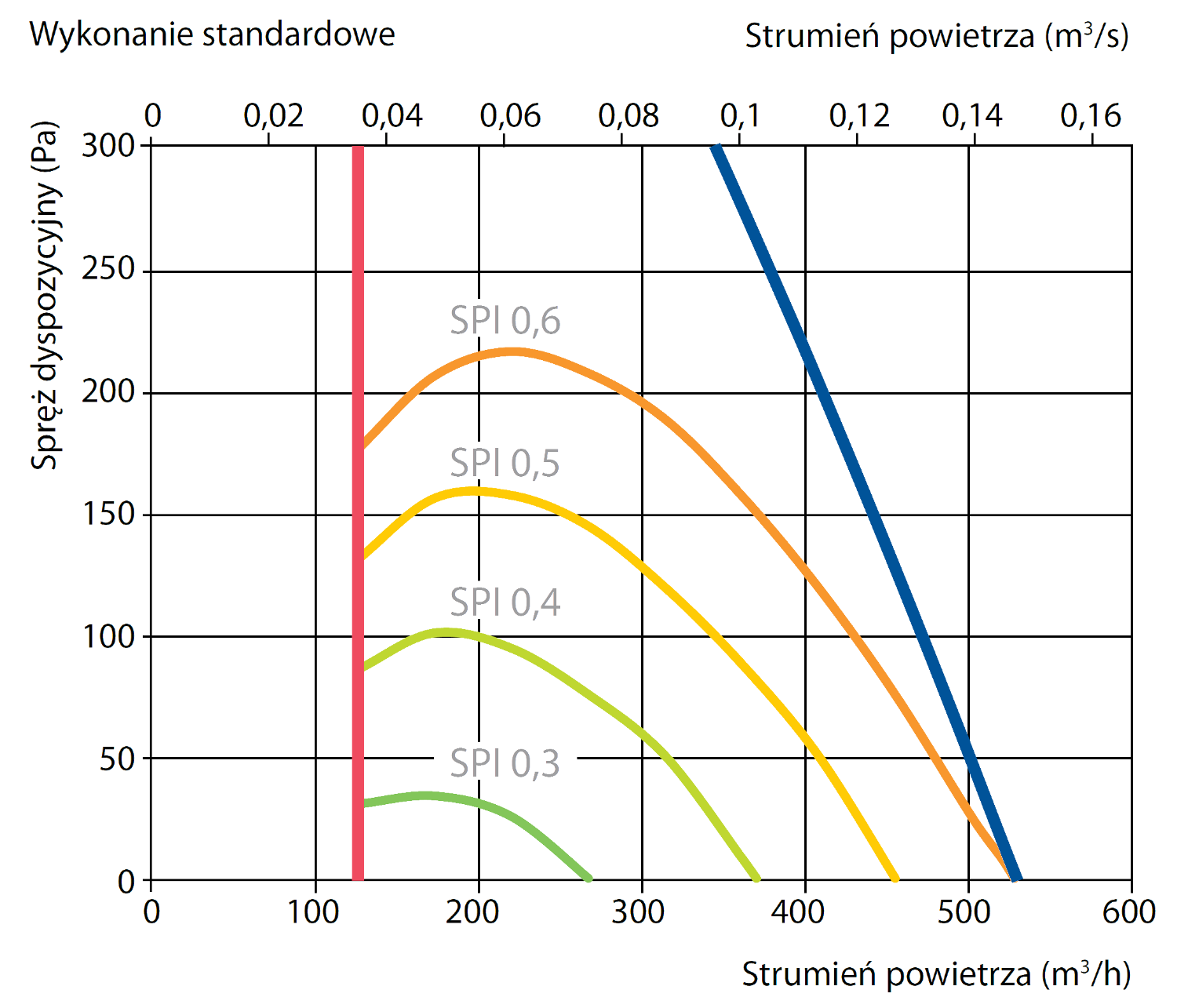 | Pobór mocy przez napęd wentylatora przy przepływie znamionowym | W | 69 | |