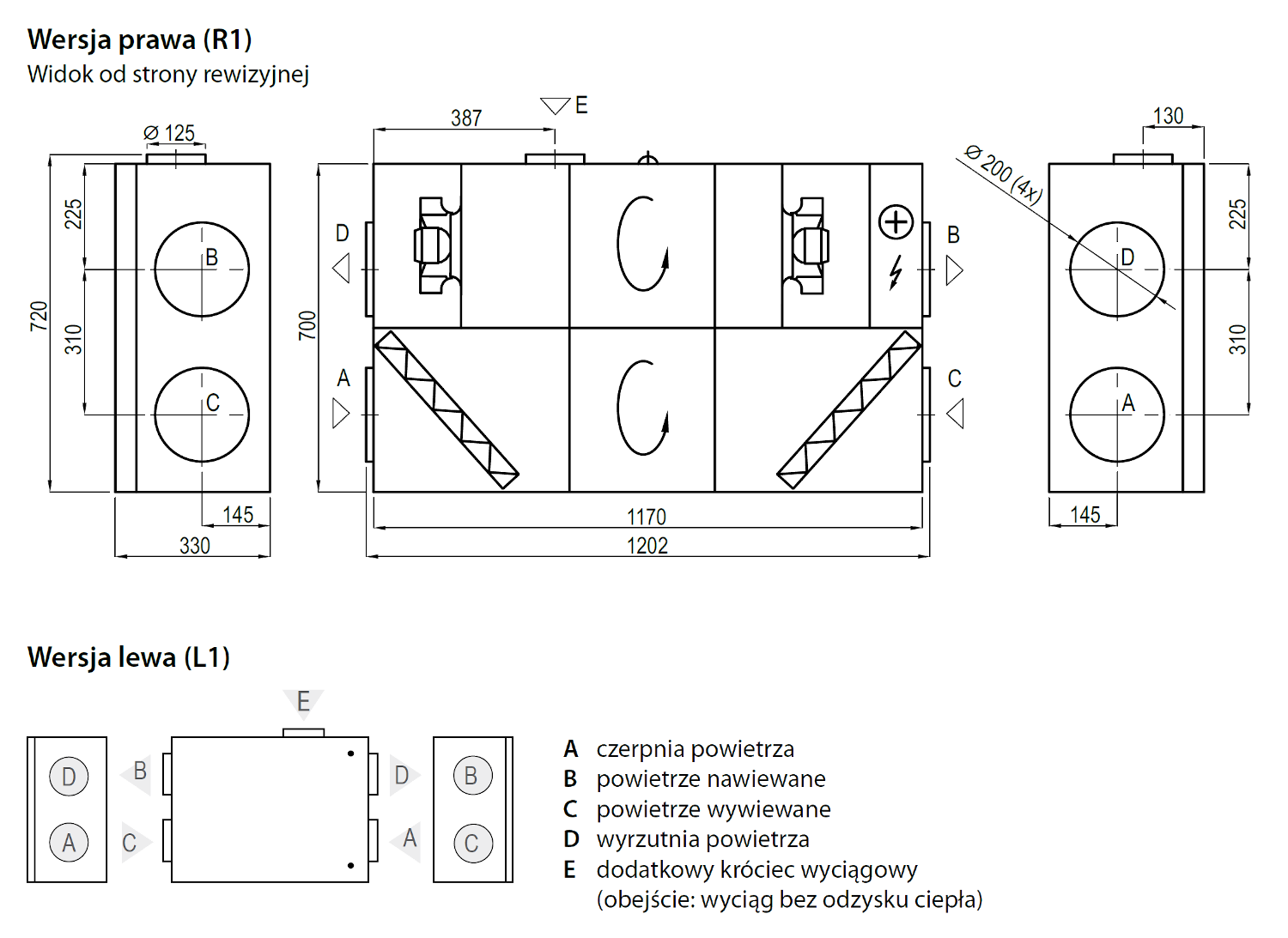 | Awaryjne wyłączenie w przypadku osiągnięcia krytycznej temperatury | W przypadku uzyskania zbyt niskiej lub zbyt wysokiej temperatury powietrza nawiewanego, centrala wyłącza się automatycznie |