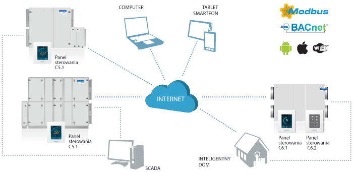 Centrale wentylacyjne z automatyką wyposażone są w zintegrowany moduł sieciowy umożliwiający nadzorowanie pracy urządzenia za pomocą Internetu.