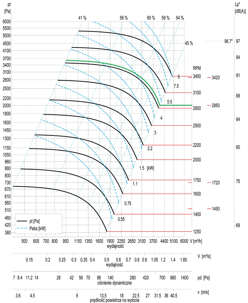 Wentylatory zostały wyposażone w napęd bezpośredni realizowany przez asynchroniczne silniki indukcyjne zgodne IEC-34. IP55, klasa izolacji F. Wykonanie standardowe: silniki trójfazowe jednobiegowe o napięciu zasilania 3~230/400V, 3~400/690V, 50Hz (Δ/Y), bez wbudowanych czujników temperatury uzwojeń typu PTC/TK, których prędkość obrotowa nie może być regulowana. Wykonanie z możliwością regulacji obrotów: silniki trójfazowe jednobiegowe o napięciu zasilania 3~230/400V, 3~400/690V, 50Hz (Δ/Y), z wbudowanymi czujnikami temperatury uzwojeń typu PTC/TK, których prędkość obrotowa może być regulowana przemiennikiem częstotliwości w zakresie 25-50Hz.