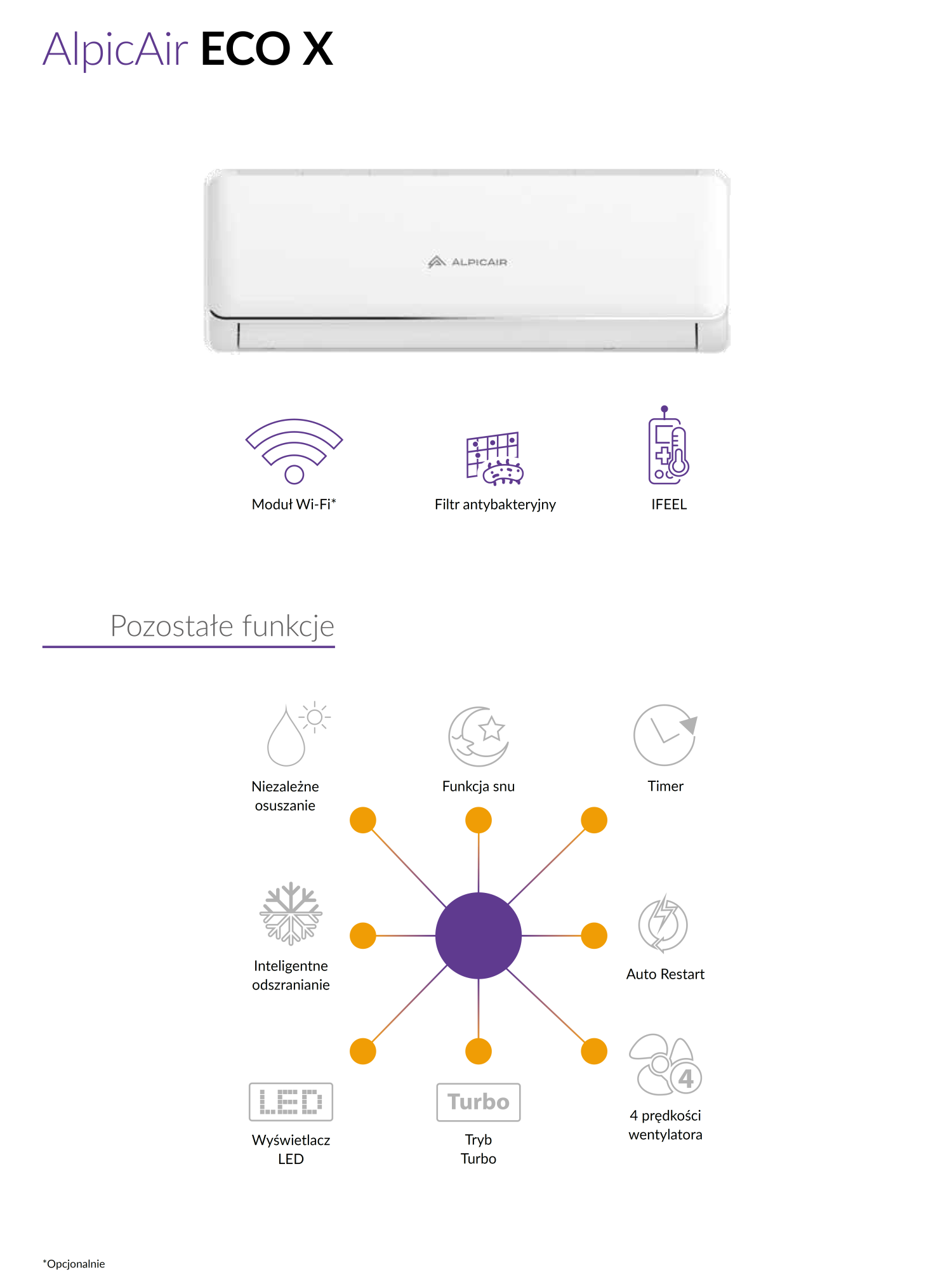 ECO X to klimatyzator ekonomiczny, przyjazny dla użytkownika, bazowy model AlpicAir to najlepszy wybór dla osób ceniących sobie niskie koszty zakupu i użytkowania. To model, który w bardzo atrakcyjnej cenie łączy w sobie wszystkie niezbędne funkcje, klasyczny design i nowoczesną technologię.