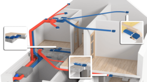 • niewielka średnica kanałów daje możliwość instalacji całego systemu pod wylewką (w warstwie izolacji) lub nad sufitem podwieszanym. W dodatku połączenia na uszczelkach ze spienionego polietylenu, zapewniają szczelność w każdych warunkach, a prawidłowy sposób rozprowadzenia przewodów gwarantuje niewielkie straty ciśnienia na instalacji.
