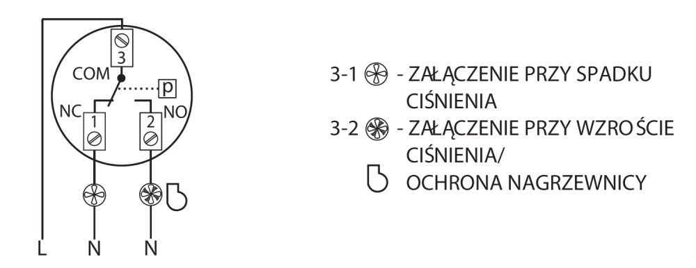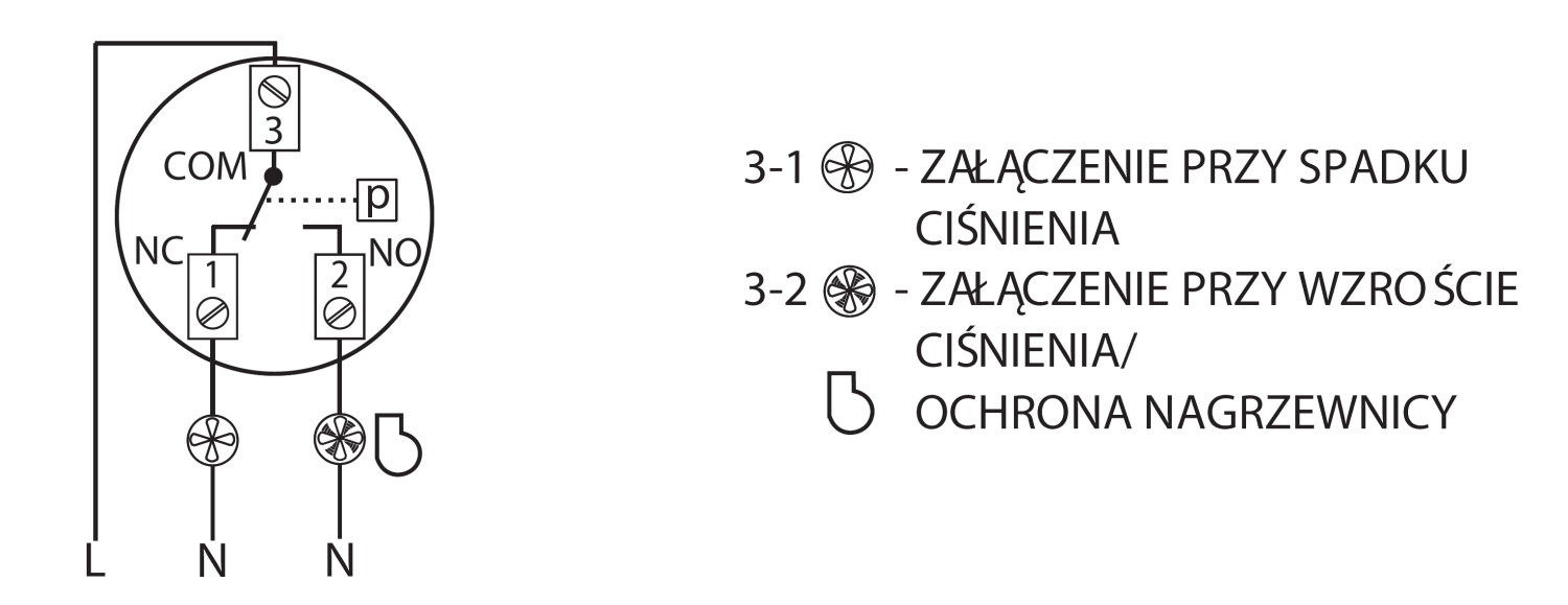 Presostat różnicowy z diafragmą silikonową. Przełączające styki bezpotencjałowe. Nastawę żądanego poziomu ciśnienia można wykonać za pomocą śrubokręta. Zalecany montaż pionowy. Stopień ochrony IP 54. Maksymalne ciśnienie robocze 2500 Pa. Parametry styków: 250V, AC1: 1,5A / AC3: 0,4A (VDE 0630, EN 1854). Sondy pomiarowe PVC-SET należy zamówić oddzielnie.