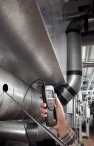 W celu ustalenia, czy system klimatyzacyjny lub wentylacyjny działa prawidłowo, należy skontrolować między innymi prędkość przepływu powietrza lub strumień objętościowy w kanale. Jeżeli prędkość przepływu powietrza jest zbyt niska, nie następuje dostateczna ilość wymian powietrza przeznaczona dla danej kubatury i optymalna jakość powietrza w pomieszczeniu nie może być dalej gwarantowana. Anemometr termiczny testo 425 do szybkich i prostych pomiarów przepływu powietrza.