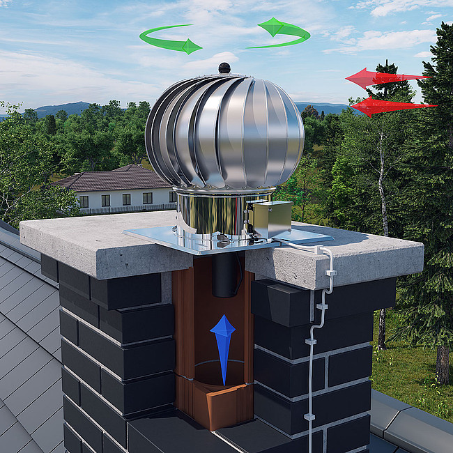 Obrotowa nasada kominowa TURBOWENT HYBRYDOWY jest urządzeniem dynamicznie wykorzystującym siłę wiatru do wspomagania ciągu kominowego, dodatkowo wyposażonym w silnik bezszczotkowy małej mocy do jego skutecznej stabilizacji. Montuje się ją na wylotach kominów wentylacyjnych o działaniu grawitacyjnym.