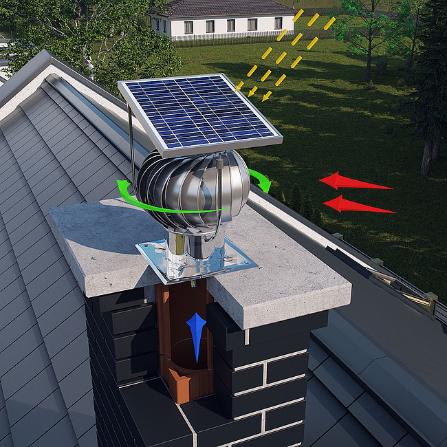 Ekologiczna nasada kominowa wyposażona w silnik i panel fotowoltaiczny.
