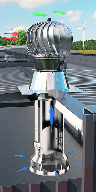 Obrotowa nasada kominowa TURBOWENT Ø400-Ø500 jest urządzeniem dynamicznie wykorzystującym siłę wiatru do wspomagania ciągu kominowego. Niezależnie od kierunku, siły i rodzaju wiatru, turbina nasady obraca się zawsze w jedną i tę samą stronę. Montuje się ją na wylotach kominowych wentylacji grawitacyjnej, szczególnie na zbiorczych kanałach wentylacyjnych w budynkach wielorodzinnych i użyteczności publicznej.