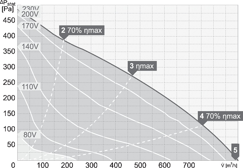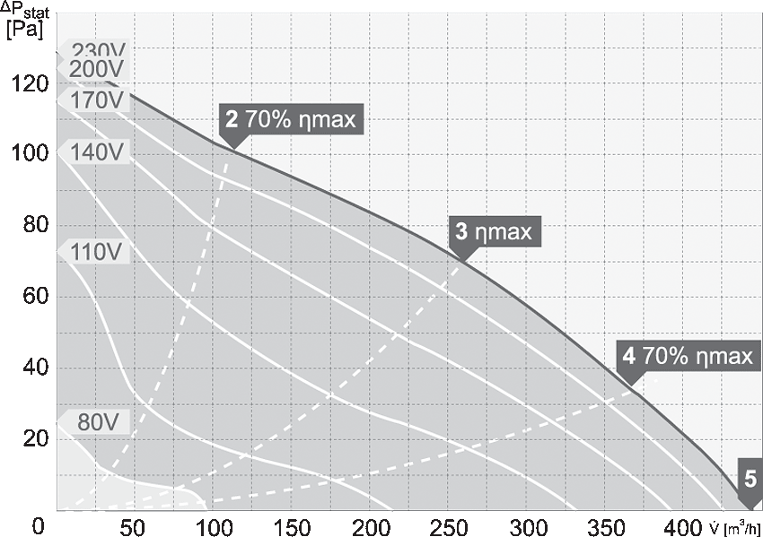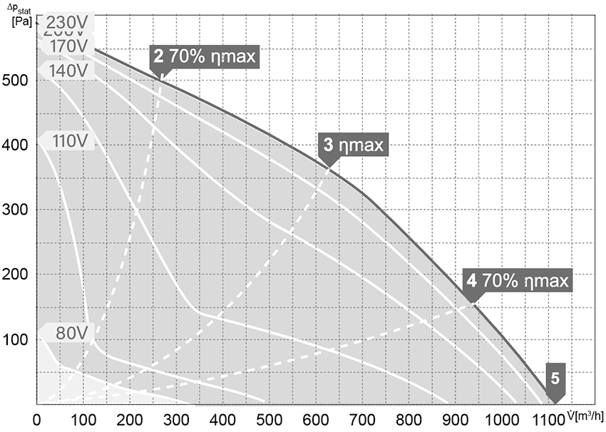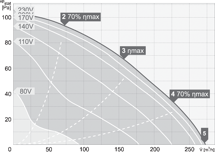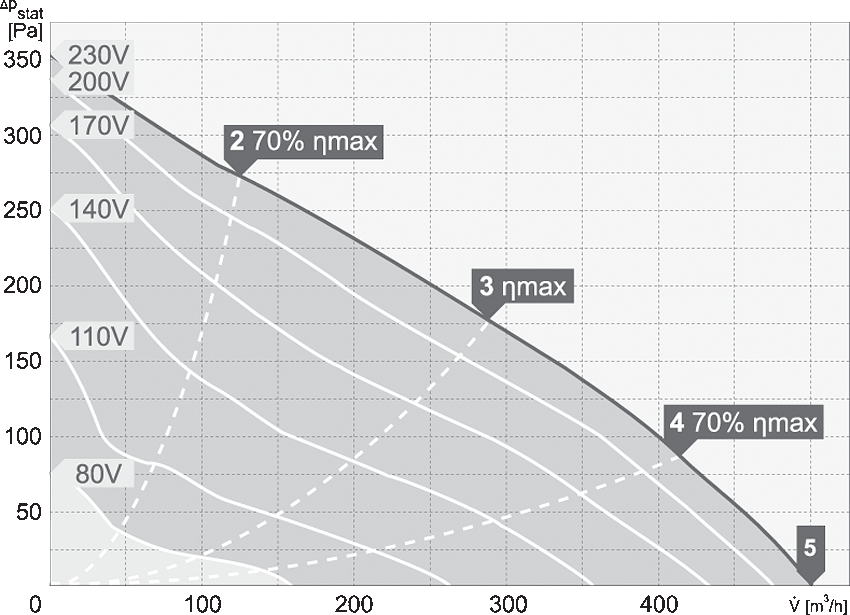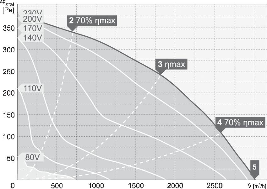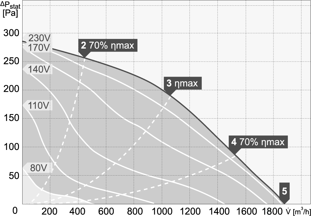 Silniki są przystosowane do napięciowej regulacji prędkości obrotowej w zakresie 80-230V (modele jednofazowe). Stopień ochrony urządzenia IPX4. Stopień ochrony silnika dla modeli 220-315 IP33, dla modelu 355 IP44. Klasa izolacji F.