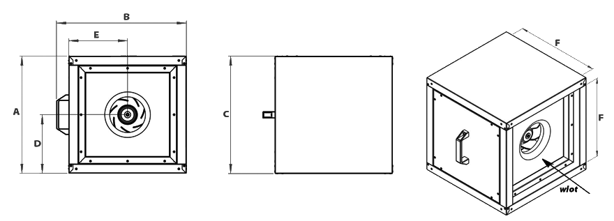 Promieniowy wentylator kanałowy przeznaczony do zabudowy w systemie kanałów o przekroju prostokątnym. Obudowa wykonana z galwanizowanej blachy stalowej ma kształt sześciany składającego się z ramy i paneli bocznych, izolowanych (poza panelem wlotowym) warstwą wełny o grubości 30 mm. W wykonaniu standardowym wlot stanowi wyprofilowany pierścień bez króćca przyłaczeniowego. Wylot uzyskuje się przez djęcie jednego z izolowanych paneli bocznych. Wylot można  skonfigurować względem wlotu pod kątem 90° lub w linii prostej.