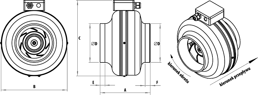Promieniowy wentylator kanałowy. Obudowa wykonana z tłoczonej blachy stalowej cynkowanej galwanicznie i lakierowanej epoksydowo na kolor szary (RAL 7035). Obudowa posiada znormalizowane króćce przyłączeniowe z tolerancją ujemną (nyplowe) do podłączenia w systemie okrągłych kanałów wentylacyjnych. Na obudowie przymocowano puszkę przyłączeniową.