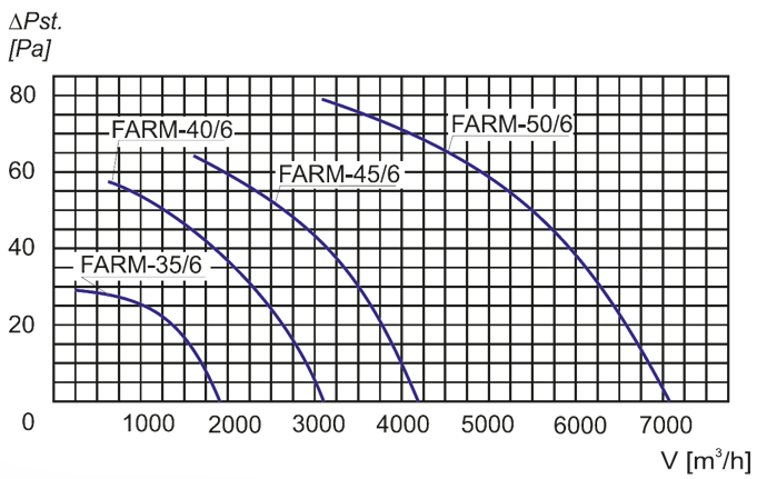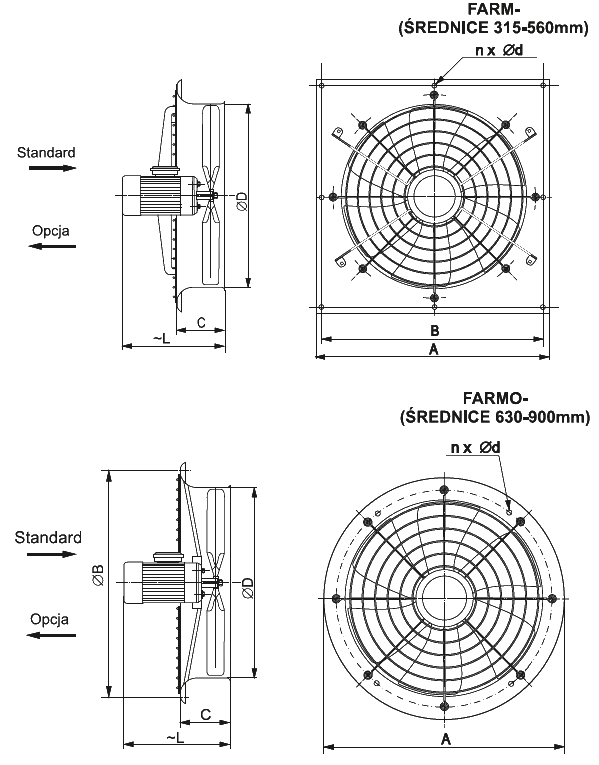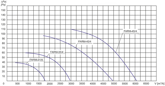 Wentylatory FARM dostępne są w obudowie kwadratowej (średnice otworów od fi315 do fi560 włącznie), większe modele dostępne w obudowie okrągłej – FARMO Obudowa wentylatora została wykonana z blachy stalowej malowanej proszkowo dzięki czemu wentylator jest znacznie bardziej odporny na uszkodzenia mechanicznej niż wentylatory w obudowie z tworzywa. W wentylatorach FARM zastosowano specjalny silnik o wzmocnionej obudowie i szczelności (stopień ochrony IP66)
