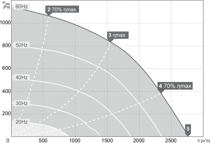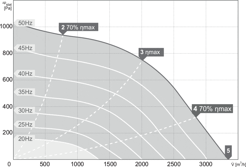 Prędkość obrotowa modeli z silnikami trójfazowymi (3×230Δ/3x400Y) może być kontrolowana za pomocą przemienników częstotliwości, wyłącznie w zakresie częstotliwości (obrotów) podanych w tabeli/wykresie doboru. Zalecany czas przyspieszania i hamowania przetwornicą (rampa): 20-30 sek.