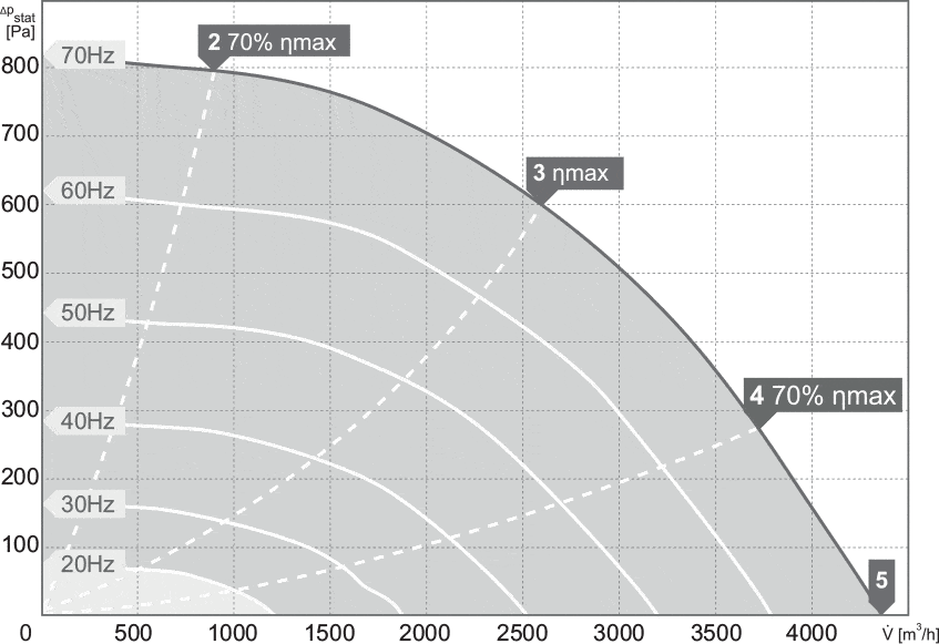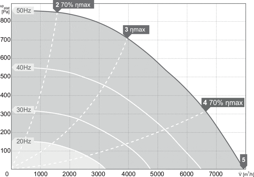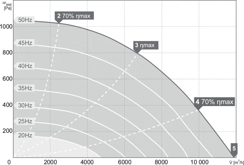 Prędkość obrotowa modeli z silnikami trójfazowymi (3×230Δ/3x400Y) może być kontrolowana za pomocą przemienników częstotliwości, wyłącznie w zakresie częstotliwości podanych w tabeli/wykresie doboru. Zalecany czas przyspieszania i hamowania przetwornicą (rampa): 20-30 sek.